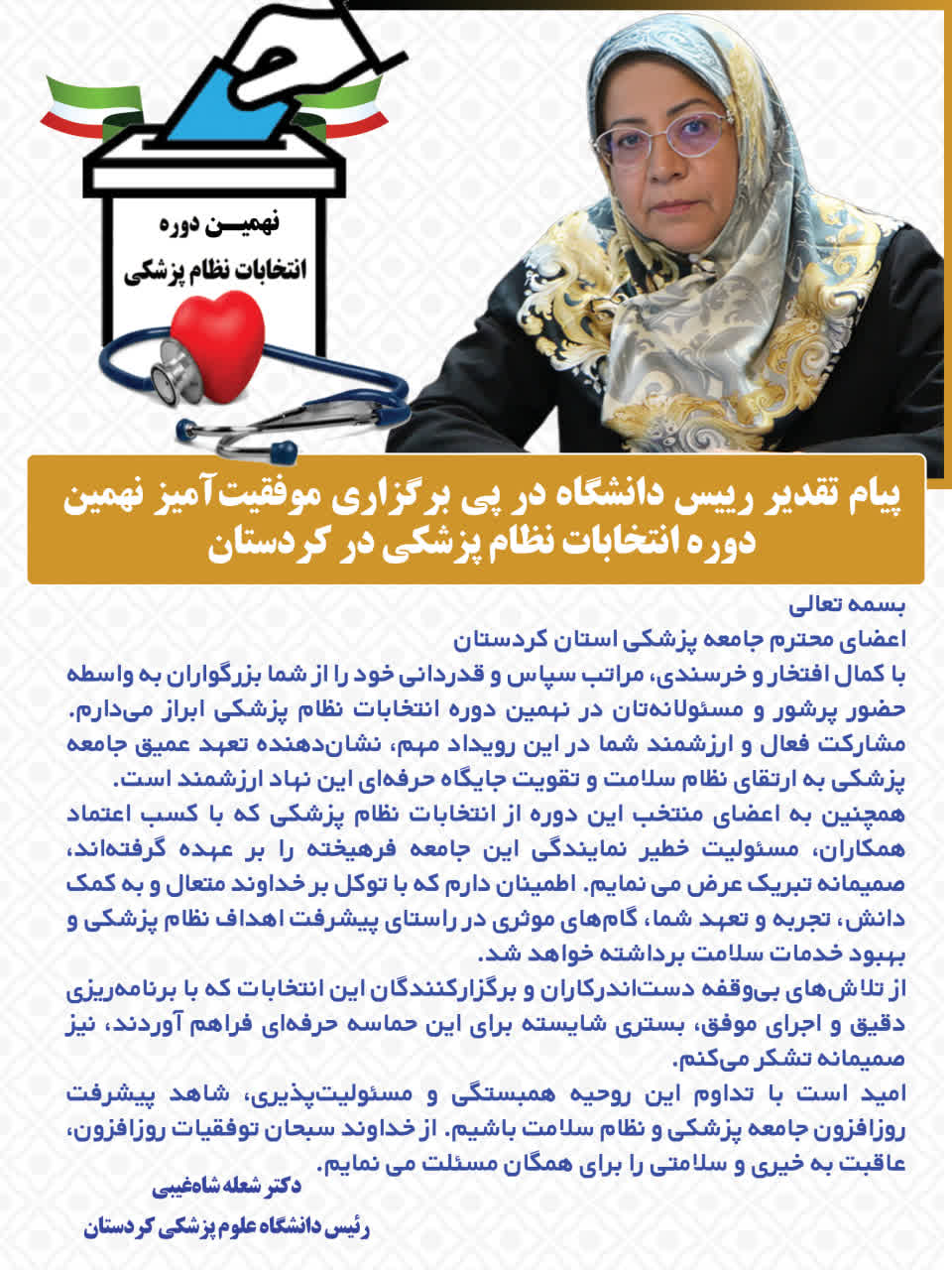 دکتر شعله شاهغیبی، رئیس دانشگاه علوم پزشکی کردستان، در پیامی ضمن تبریک به اعضای منتخب نهمین دوره انتخابات نظام پزشکی و قدردانی از حضور پرشور جامعه پزشکی استان، از تلاشهای برگزارکنندگان این رویداد موفق تجلیل کرد و بر نقش کلیدی نظام پزشکی در ارتقای خدمات سلامت تأکید نمود.
